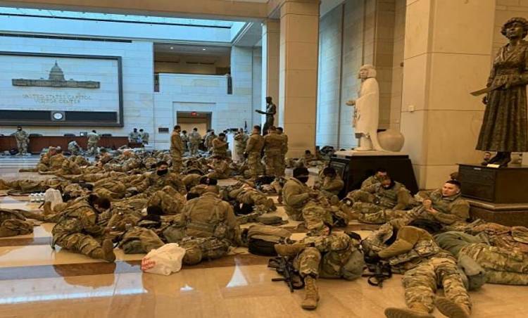 20 Ocak'ta olası olayları engellemek için Ulusal Muhafızlar başkent Washington'a gönderilmişti. Binlerce asker otobüslerle DC'ye taşınırken, ABD'li gazeteci Nathaniel Reed, Kongre binası içinde yerde yatan askerlerin görüntüsünü Twitter'dan paylaştı.